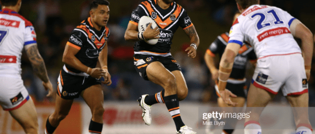 Momirovski added yet another conversion on the back of Nofa’s try and the Tigers were now 30-0 – their biggest ever half time lead at Campbelltown Stadium. They got two dropouts in the first ten minutes after the break, and while Newcastle survived the first one – just – they capitulated for the second one, allowing Nofoaluma to come away with the second try in what would become a hat trick. This time, the magic ingredient was a wide ball from Brooks to Benji, followed by a compressed harbor bridge pass from Benji to Nofoaluma in the right corner.