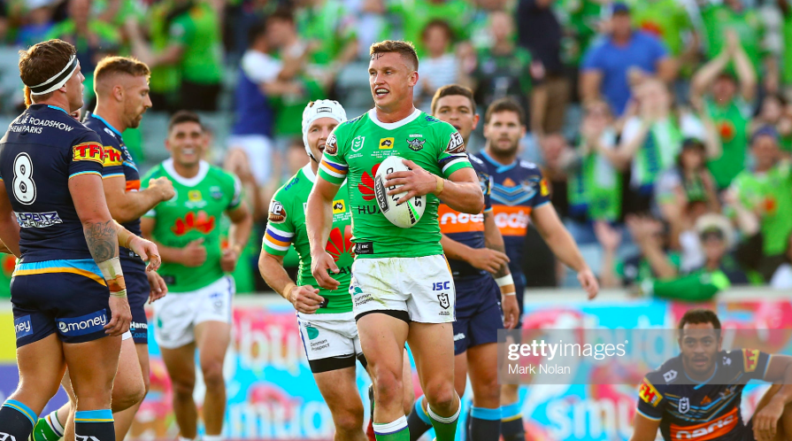 It took sixty-five minutes to get to the first try of the 2020 NRL season in last night’s match between Parra and Canterbury, so it was cathartic when the Raiders put down points in the first few plays of their season opener against Gold Coast at GIO. Bailey Simonsson took the kickoff, Kevin Proctor got the first carry, and Jarrod Wallace made a handling error on the very next play. Dunamis Lui then got a penalty on the second tackle for the Raiders, off a dangerous hit from Sam Lisone, and the green machine chose to tap and go, capitalizing immediately when Jack Wighton busted through on the left edge, skipping away from Ash Taylor and slicing past Philip Sami for the second NRL try this season, and the first hint of a terrific night with the footy.