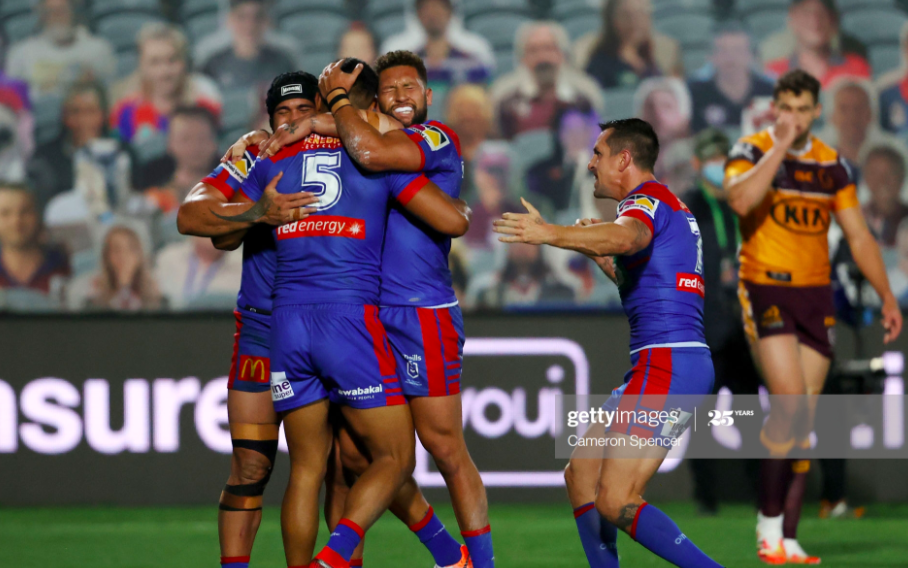 The first game of Round 6 was the fiftieth meeting of Newcastle and Brisbane since they joined the competition in 1988. The Knights had only won fifteen of those fixtures, but they had a big boost tonight after Kalyn Ponga’s long-term commitment to Newcastle, along with his rousing speech about wanting to raise the trophy over Hunter Stadium. Issac Luke gave away the first penalty one minute into his Brisbane debut, but Newcastle didn’t do much with the field position after Tim Glasby put down a tricky pass from Mitchell Pearce. Tevita Pangai Junior then gave David Klemmer his biggest hit ever, but Newcastle weren’t too shaken as a whole, receiving the first set restart eight minutes in, and then another restart a tackle late, only for Jacob Saifiti to cough up the footy on play one. Three tackles later, Payne Haas was the next to turn the ball over, and the Knights responded with their most sweeping play so far, sending the footy across to the right before Klemmer straightened the attack with a hard run.