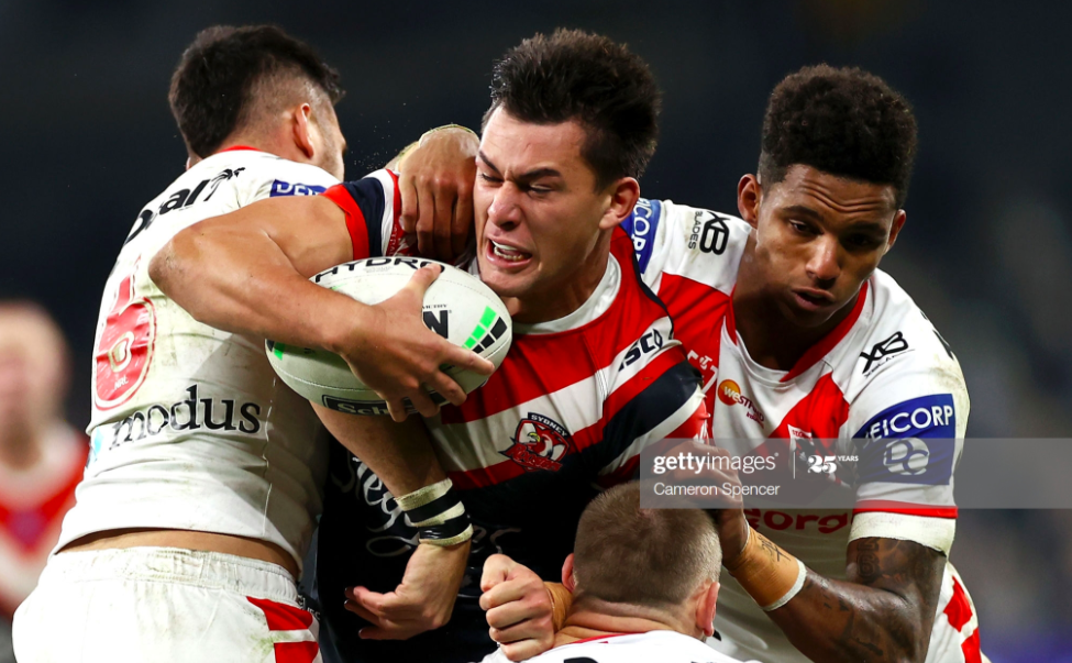 Embed from Getty ImagesEverything came together on the next play, when Dufty intensified the cut-out pass he’d sent out to Frizell a few sets before, shooting the ball faster and straighter – a bullet pass – to put Ravalawa across in the left corner, catching Hall ten metres in field with nobody to defend. Lomax missed the conversion, but scored the next try three minutes later, thanks to a pair of uncharacteristic errors from Tupou and Manu. In its own way, this was just as spectacular as Manu and JWH’s combination, as Lomax caught a bullet pass from Dufty on the other side of the field, bobbled the ball in the air, somehow regathered it at speed, and survived a bone-rattling tackle from Manu on the line to slam down the next four points for St. George. This time Lomax added the extras, levelling the scoreline to 10-10, while news emerged that Verrills had also suffered an ACL injury, meaning two Roosters were now out for the season in the space of thirty minutes. Cordner was the next to go down, after a nasty head clash with JWH after a combined tackle on Lomax, and while he remained on his park, the severity of the gash and the sheer amount of blood streaming down his face was a powerful image for a Roosters outfit that had been peculiarly hard hit by the contest so far.