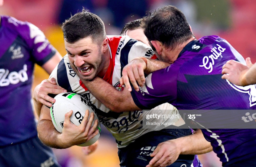 Embed from Getty ImagesThe Roosters got their next try off a sublime pair of runs from the Morris brothers – a frantic run at the start of the set from Brett, who eluded three or four tackles, and then an unbelievable carry at the end from Josh, who collected the footy from Keary, and busted his way through a tackle from Vunivalu, bending to his knees to prevent the big winger dragging him over the sideline, and literally pivoting around his right shoulder, limbs flailing in the air, to slam down the most spectacular try of the game. Yet the Storm came back, and came back big, with a pair of back-to-back tries ten minutes out from the end, the first of which saw Hughes collect a wide ball on the right edge, then dodge and weave around three defenders to bring it to a four point game when Smith added the extras from right in front. The purple army scored again on the restart, when Tupou had a clean shot on the high ball, but followed a night of safe collections by dropping it cold, leaving it open for Hughes to set up a harbor bridge pass to Momirovski, who pivoted away from Josh Morris and Tupou to the line, where he slammed through a last-ditch effort from Keary to level the scoreline.