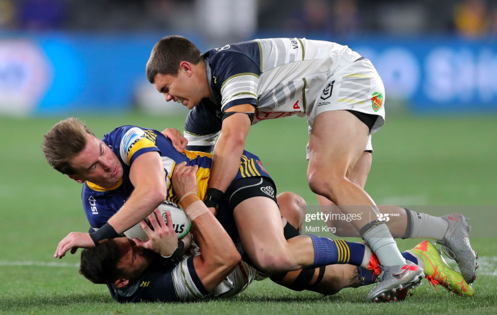 All it took was a bullet pass from Gutherson to Jennings for the first try – exactly the play that Drinkwater had attempted with O’Neill – putting Parra six ahead once Gutho bookended it all by slotting the first conversion through the posts. They’d defended eight minutes of repeat sets from North Queensland and then scored on their first real touch of the footy, so there was no question who was dominant as Fergo got the restart underway.
