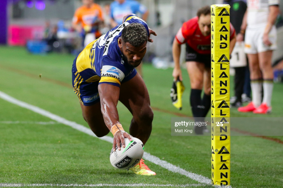 Nevertheless, Feldt missed the conversion, and the Eels resumed their rhythm as soon as they returned form the sheds, getting sixty metres on their first four tackles, with a near-linebreak from David Gower, and then their next try at the tail end of another deft Dylan Brown kick. Blake was positively balletic in the air, pirouetting above Robson and O’Neill to tap the footy back with his right palm. Field caught it on the full and slammed into the right corner before Opacic had time to bundle him into touch.