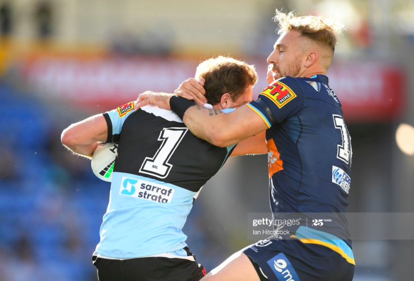 Despite an early arm wrestle, the Sharks came away with a thirty point win over Gold Coast at Cbus on Saturday afternoon. The Titans had lost two key player in a training session during the week – Kevin Proctor with a bicep injury, Phillip Sami with a dislocated shoulder – but still got the first advantage three minutes in, when Tyrone Peachey caught an average Matt Moylan kick in goal to get his men seven tackles.