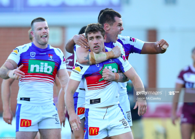 Embed from Getty ImagesThe on-field ruling was try, and this would have been a rousing sequel to DCE’s comeback try, but the replay showed Levi had contacted the ball with his right hand and sent it into Ponga, who was taken off for an HIA after coming down unbraced, and virtually landing on his head, while twisting away from the Newcastle hooker. This put a real dent in Manly’s post-try momentum, and they struggled to match DCE’s energy over the remainder of the game, despite a successful Captain’s Challenge issued by and for the Captain himself, as DCE correctly contested a supposed error in the play-the-ball to show that there had been no really discernible bobble of the ball, and that Daniel Saifiti had been applying excessive pressure on his back anyway. Manly got the footy back, but Suli put down DCE’s next pass, forcing the Sea Eagles to wait until the very last set for their next tryscoring opportunity, which came off an offside downtown penalty for Klemmer. Thirty seconds out from the end, Cust bobbled and regathered the ball, and six seconds out a pair of short balls from DCE and Suli put Funa through the line on the right edge, where he kicked to the goal area for McCullough to launch himself on the football and appear to win the game for Newcastle.