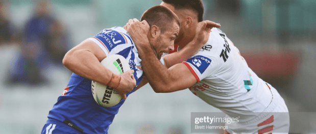 RMF and Luke Thompson got the Dogs rolling again with two big runs up the middle, and Foran took on kicking duties immediately, booting it to the right edge, where Jason Saab fumbled it in the air and conceded six more tackles to Canterbury right on the St. George line. JMK had a second shot at the line, this time on the other side of the posts, and while the Red V rolled him onto his back this time around, they conceded even more pwhen Lawrie wasn’t square, and then gave six again for a McInnes ruck error.