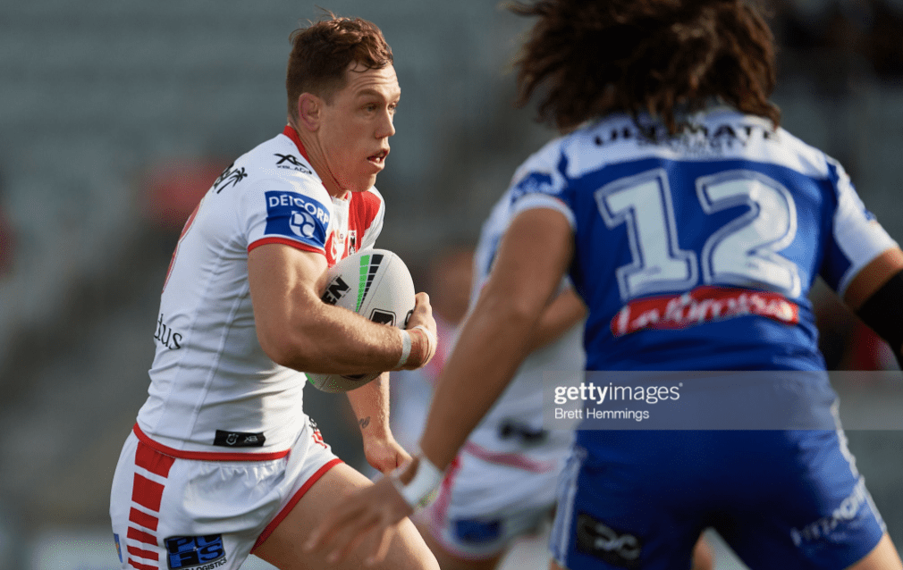 The Dragons were coming off thirty over Manly when they hosted a Bulldogs outfit raring to replicate their only win of the season over St. George in Round 4. Jason Saab was replacing Jordan Pereira, suspended for a grade one shoulder charge against Reuben Garrick, when Kerrod Holland was starting in place of Reimis Smith, suspended for a dangerous tackle on Alex Glenn. Lachlan Lewis was replacing Brandon Wakeham in the halves, and Nick Meaney was starting at fullback with DWZ out to the wing.