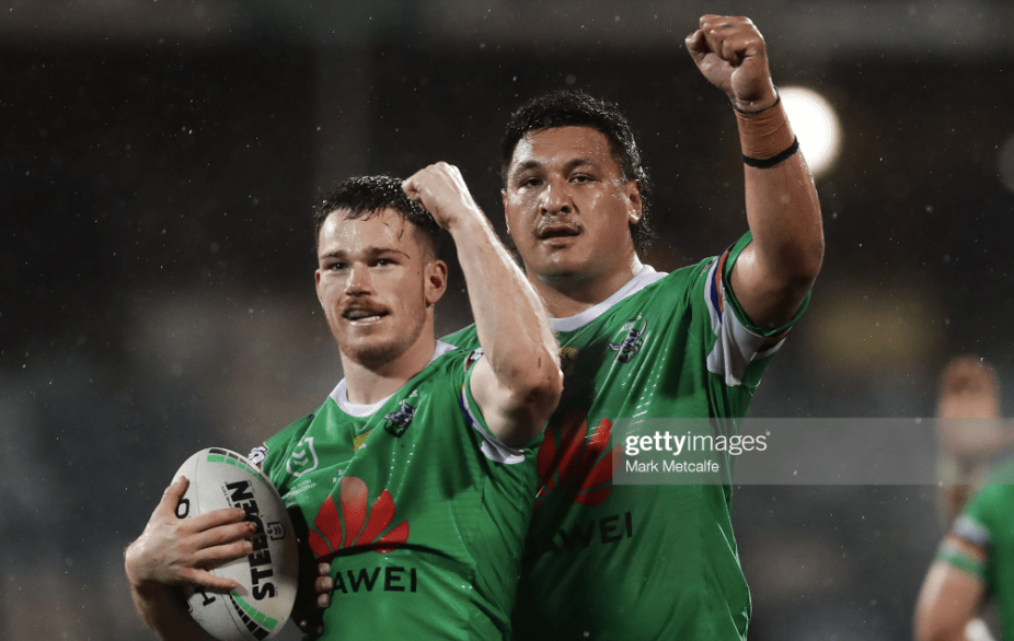 Walker was cleaned up on the last but the Bunnies still had one more spectacular sequence in them – a sublime crossfield kick from Reynolds that slid and spun along the sodden turf, defying Valemei, and forcing Croker to wrap it into his chest and tumble over the try line. Rapana had also came in for the play, and collided into Valemei for a plosive head knock, so he became the second Canberra fullback to leave the field, as the Raiders dug in to defend their six point lead over the last ten minutes.