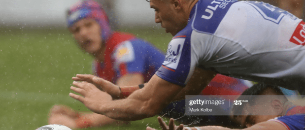 The Knights were looking to go back-to-back for the first time since Rounds 1 and 2 when they hosted Canterbury in the Hunter on Saturday afternoon, but they found the Dogs pretty spirited in both attack and defence, and struggled to put down points for the first hour of the game. With the rain pouring down from the outset, Lachlan Fitzgibbon lost the ball in the first thirty seconds, although Kalyn Ponga picked up Lachlan Lewis’ first kick without too much trouble, and then came up with a great bounce at the end of Newcastle’s first completed set, although it came to nothing when Fitzgibbon was called offside. Despite Hymel Hunt breaking through the line on the right edge, Canterbury had the upper hand already, as Dallin Watene Zelezniak did well for his first take under a Ponga bomb, and Jeremy Marshall-King executed the best early kick of the game, driving the ball deep between Ponga and Enari Tuala into the in goal area. Bradman Best responded with the best kick return of the game, making his way back to the Bulldogs’ thirty, but Nick Meaney was faster, dragging him over the sideline and forcing him to flick the footy back inside to a sea of Canterbury jerseys.