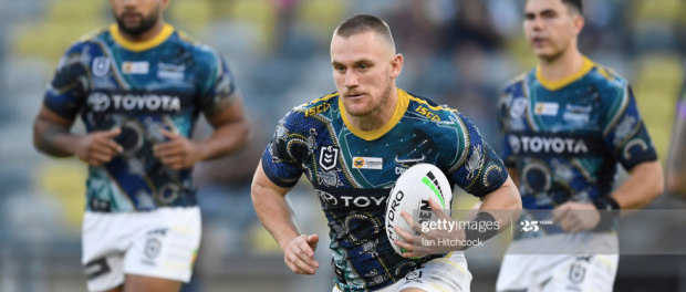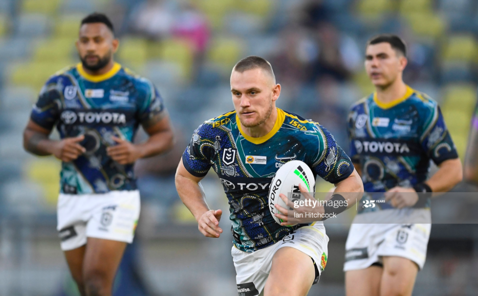 Embed from Getty ImagesWith the game settling into an error-fest, one team had to break the deadlock – and Clifford tried to do it with a bold set play out of the scrum, kicking on play one to the right corner, where Rapana got to it five metres out only to lose the ball in goal. Valemei arrived at it next, and initially seemed to have conceded a dropout, only for a Bunker review to deem that Hamiso Tabuai-Fidow had got there first, turning a North Queensland dropout into a fresh set for Canberra. Finally, the Raiders broke the stalemate, as Curtis Scott found space for Cotric, who stormed from the twenty to the Cowboys’ forty, fending off Hampton before popping the footy across to George Williams, who also outsped Hampton to get the ball down. The try looked even better in slow motion, from Cotric’s deft receipt of the football – collecting it in his left hand and then securing it in his right – to Williams’ elegant skip and dance over Hampton at the final moment. Croker’s conversion locked things up at 6-6, and Josh Papalii made the best offload on the next set – on the ground to Rapana – while Wighton nailed the kick chase to trap North Queensland five metres out from their line. Rapana followed with his best moment at fullback, sliding on the sideline to pop a Clifford kick back in field, but was less confident a set later, when he coughed up the footy while trying to secure and return it from in goal.
