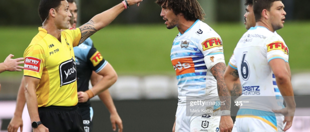 From there, both teams wisely chose to relinquish a challenge – the Sharks when Hipgrave almost seemed to hand the footy to Graham for what was eventually deemed a Moylan strip (a call that seemed much more intuitive when watching the replay), and the Titans when Peachey was pinged for a high hit on Mulitalo a few minutes later.