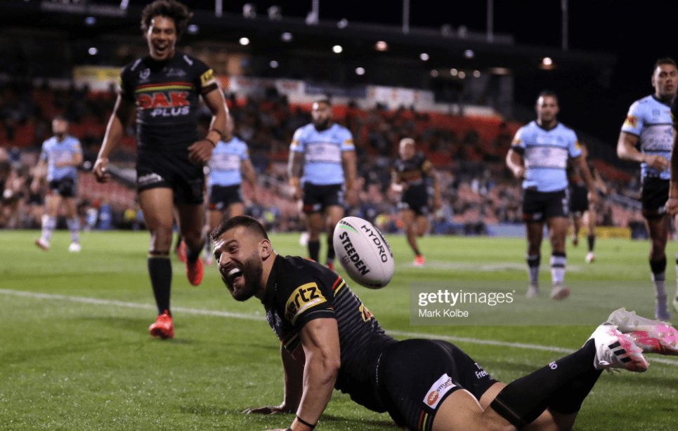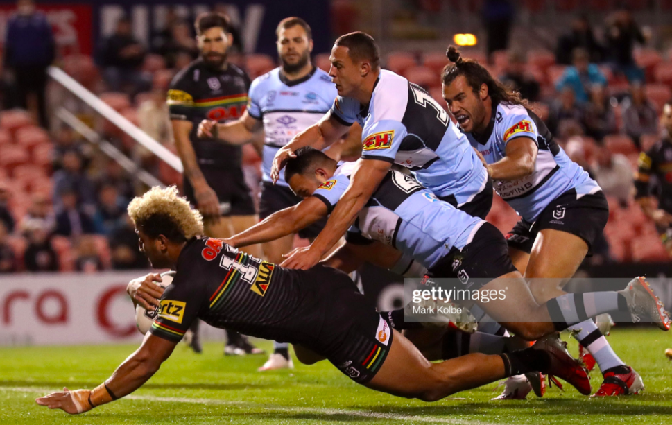 It was first against seventh when the Panthers hosted Cronulla at home on Friday night, looking for their tenth win in a row after scoring first in thirteen consecutive games. Sione Katoa had scored the most tries by a Shark (13) after 14 rounds since Andrew Ettingshausen in 1988 – and, with a win, Penrith could get three points ahead of both Melbourne and Parra, not an unlikely outcome with Shaun Johnson out with a groin injury, and Braydon Trindall starting in the halves for only his second NRL game.
