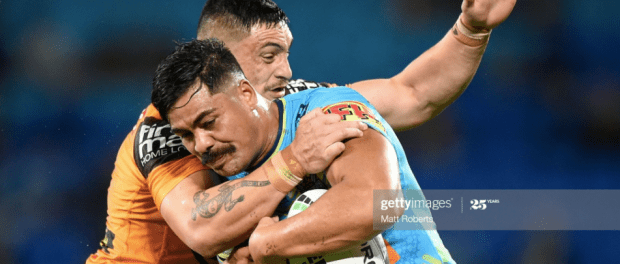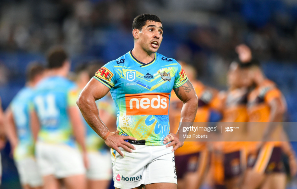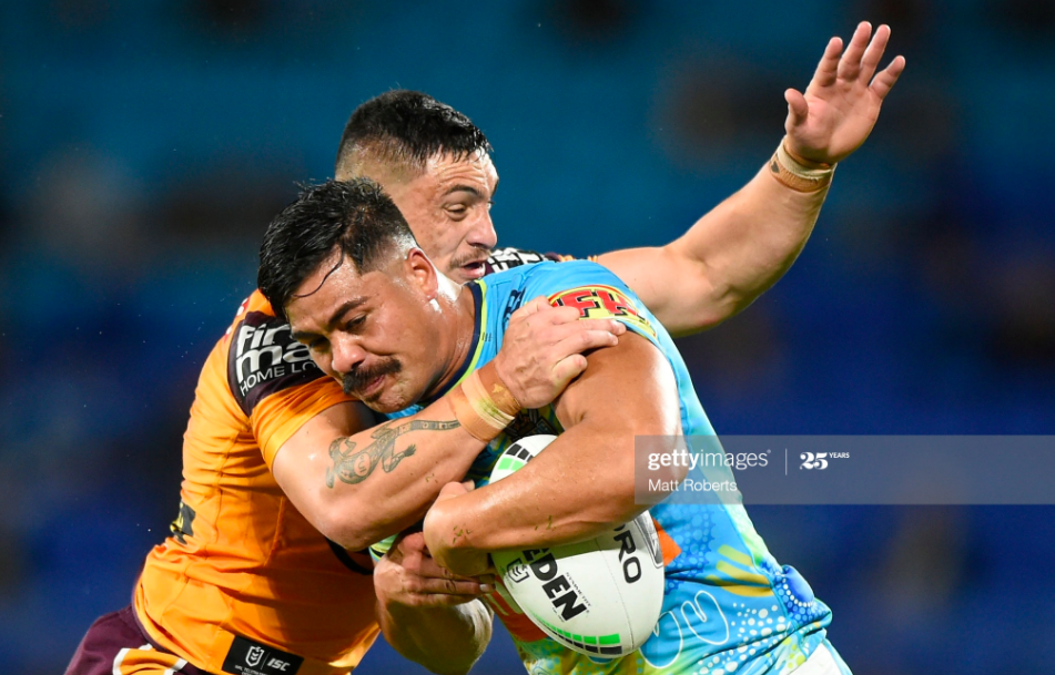 Paix claimed the four points, but the replay showed he’d lost the Steeden into the best clutch tackle all night from Fotuaika and Taylor. These two defensive efforts were as good as tries for Gold Coast, strengthening their resolve over the last ten minutes as they repelled every attacking combination that Brisbane could muster, culminating with a superb one-one-one tackle from Arrow on Kennedy five minutes out. The Titans followed with a successful Captain’s Challenge to contest a Tonumaipea knock-on, and Brisbane responded with a pair of big harbour bridge balls on their next set, shifting the Steeden from one side to another, until Thompson came up with a heroic one-man effort to dislodge it from Dearden before he could get to the kick.