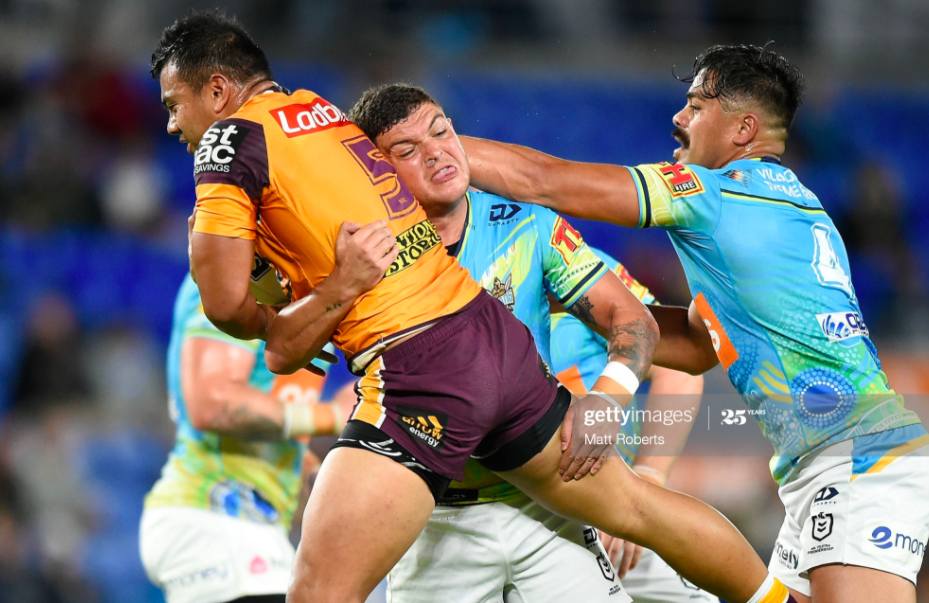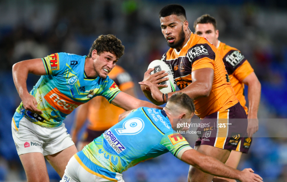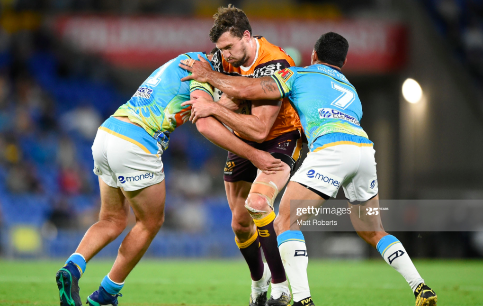 It was 13th against 15th when the Titans hosted Brisbane on Saturday afternoon, with both teams completing pretty smoothly until Alex Glenn was pinged for an accidental offside two and a half minutes in. The big men laid the platform on the next two plays before the Titans headed left, where Corey Thompson did well to stay in field, allowing Jarrod Wallace to straighten the attack on the fourth. Gold Coast now headed right, and Corey Oates slammed into AJ Brimson, knocking the footy loose and leaving it wide open for Herbie Farnworth to kick it forward, and then get his boot to it for a second time, only for the play to be called back for a Brisbane scrum feed.