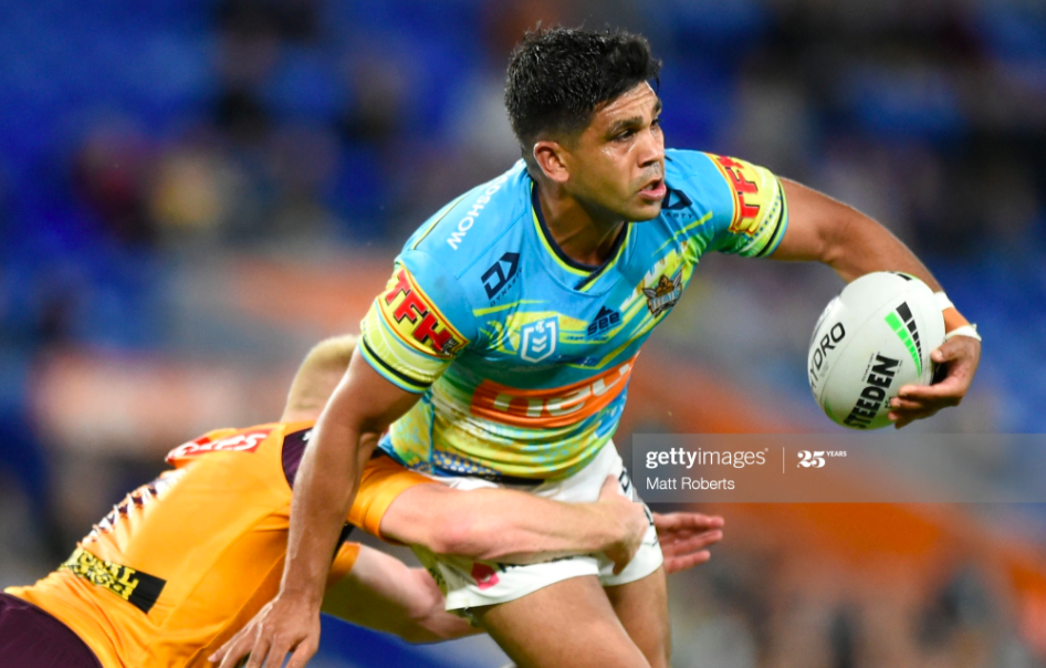 This should have been a certain try, so it was spectacular to see Thompson slide in at the last moment to bobble the ball out of Fifita’s grip, giving the Titans the upper hand for the last few minutes before the break. They glimpsed a try with two big plays as the sheds approached – a linebreak from Don down the right side, and then a fast-paced conclusion to their final set, which moved through a Fogarty kick, an error from Carrigan, and then a second Fogarty kick that Kennar and Don converged upon in goal.