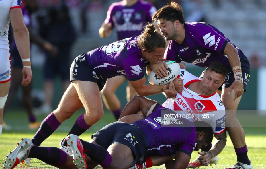 All of a sudden the second half had intensified for both teams, as Frizell and McInnes capped off one of the Dragons’ fastest sets so far, and what initially appeared to be a botched play-the-ball from the purple army turned into the second crowding penalty for St. George since the break, this time for Clune. This set looked like it might be the one for Melbourne, from the opening footwork from Momirovski, to a series of rapid shifts in direction over the second and third plays, until a huge hit from Lomax on Papenhuyzen gave St. George the show of strength they needed.