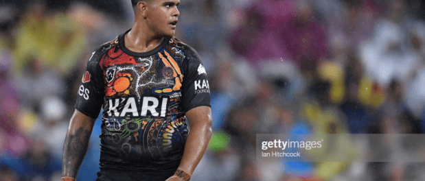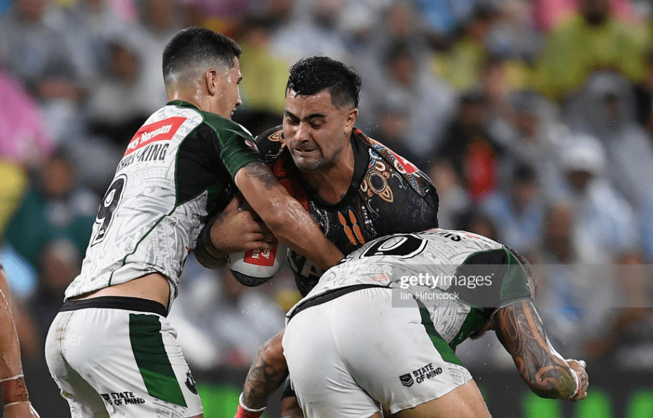For the moment, however, the green and white were on a roll, as Luai stuck a boot on the sideline to get his men yet another penalty, while Walker and Marsters crowded him on each side to confirm that this had indeed been an incorrect restart. With so much momentum now behind them, there was a real risk that they might score three in a row, but they lost a bit of energy when Tapine struggled to play the ball, while the Indigenous men got a big let-off when Manu tapped Benji’s kick over the dead ball line.