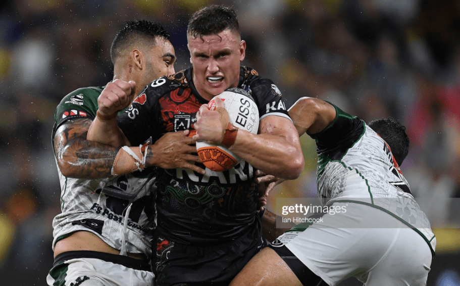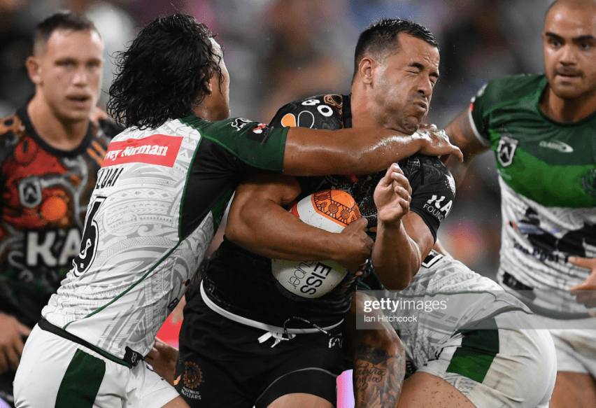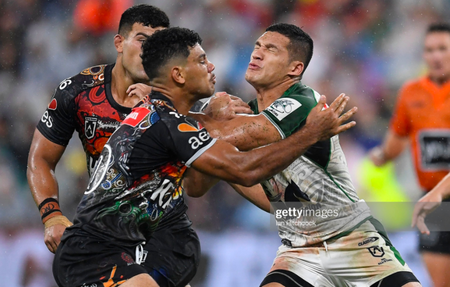 Andrew Fifita couldn’t offload on the second tackle, and Cotter was grounded by Fish on the third, while Thompson was forced to clean up a wayward pass on the fifth, before Peachey was sent to the sin bin, forty seconds out from the third break, for pushing CNK to ground. Somehow, the Indigenous All Stars had wilted in the wake of their dropout, as all the exhaustion of an hour of defence took its toll in the first fracas with a real edge of aggression – between Brian Kelly and Issac Luke on the sideline.