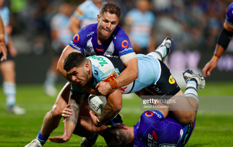 Napa took the first and fourth runs to get the game rolling, and Canterbury made terrific metres, forcing the Sharks to start their first set within their own ten. Four Bulldogs came in to hold up Sione Katoa on the third tackle, but he got the offload away to Blayke Brailey, before Johnson showcased his first right-foot step to poke his nose through the line. The Dogs got even more field position on their second set, thanks to an illegal strip from Toby Rudolf, and Napa took his third massive charge.