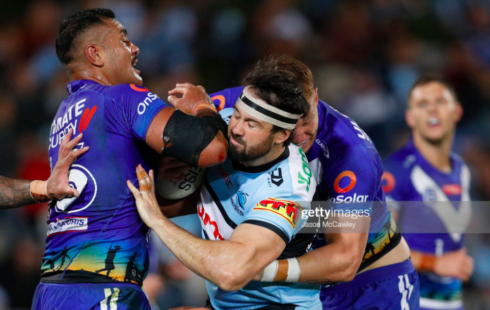 Hamlin-Uele followed Talakai with five post-contact metres, and the Sharks shifted right on the fourth play, where Dugan managed to pop the footy inside just before Hoppa and Cotric combined to drag him over the sideline. Flanagan was penalised for being offside, and the Sharks settled into their first sustained field position of the second stanza, as Tracey came up millimetres short on the left edge, and Ramien required three waves of defenders to hold him up on the other side of the park.