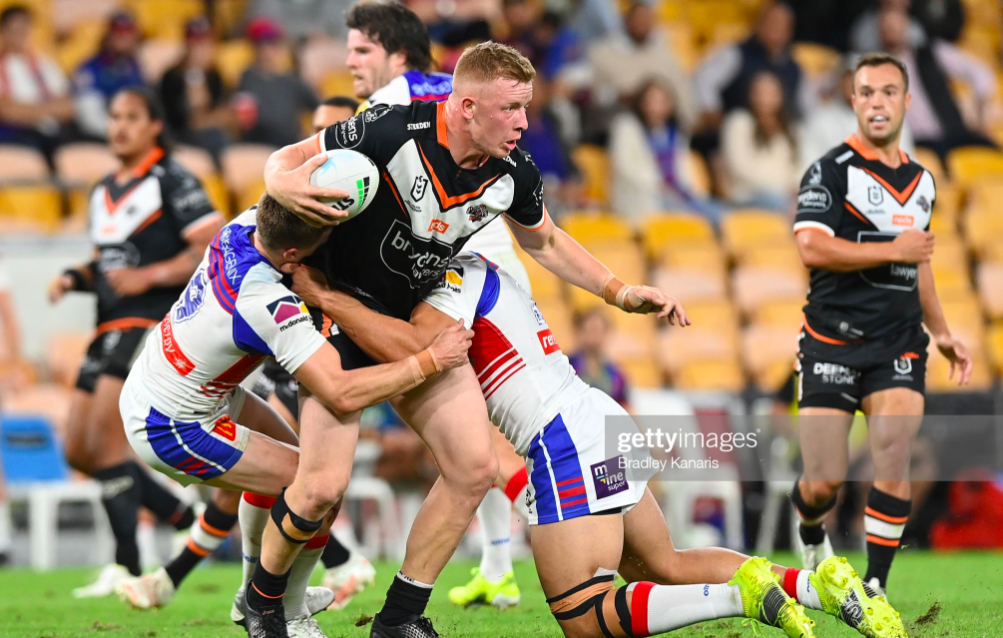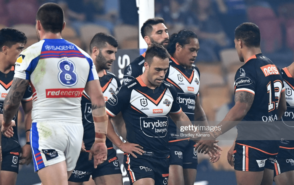 The Knights had managed to stem the flow of Tigers tries over the second quarter but they were still twenty ahead at 24-4 heading into the sheds. They had a brief mini-surge in the last two minutes, when Luciano Leilua was pinged for an offside error, and Barnett took the footy right up to the line, offloading to Conor Watson for what would have been a certain try if the Tigers hadn’t got their goal line defence in order. With an overlong kick on the last, though, the hosts retained their twenty point lead.