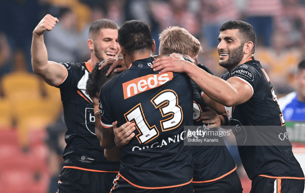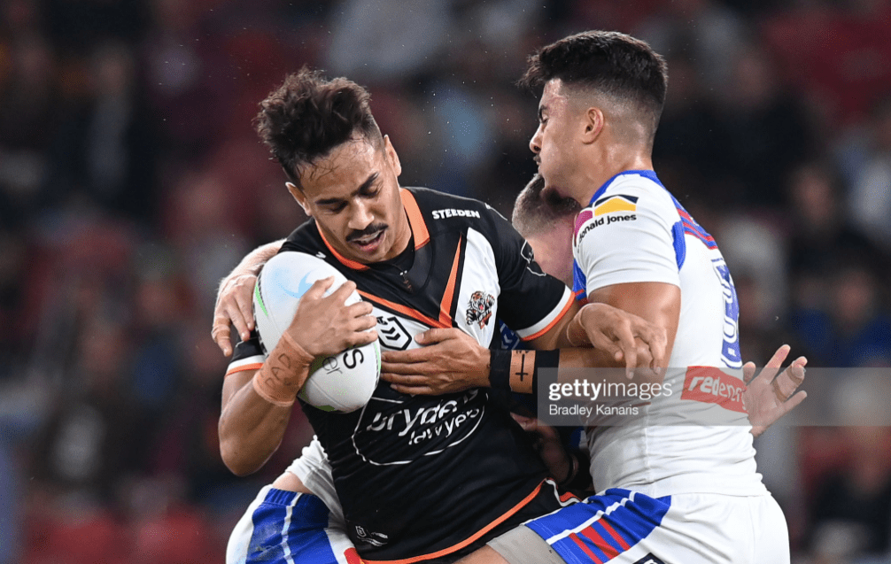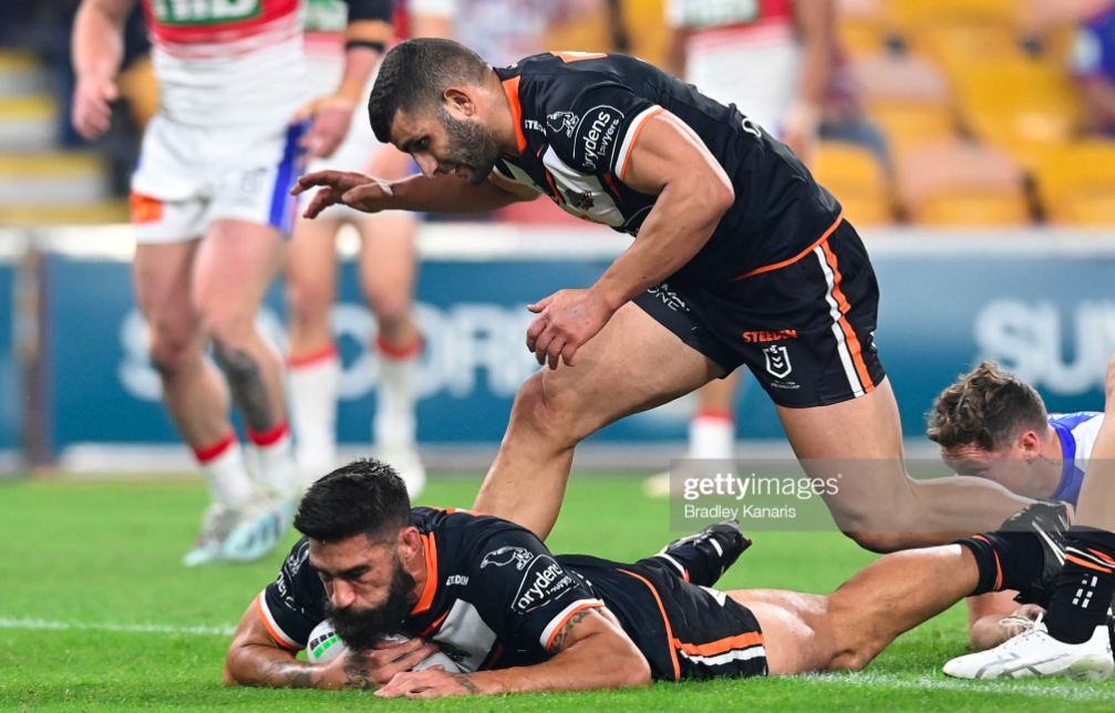 Shifting Mbye to the halves was thus a challenge to Brooks – and he sure delivered, serving up his best running game of the year (over 175 metres) and drawing deep on the vision of his legendary debut to show just how much he can do in leadership when he’s genuinely galvanised. With Tommy Talau back after being suspended for his shoulder charge in Round 8, and Tex Hoy replacing Kalyn Ponga, the stage was set for a Tigers landslide in the first quarter, and a terrific night in defence for the next hour.