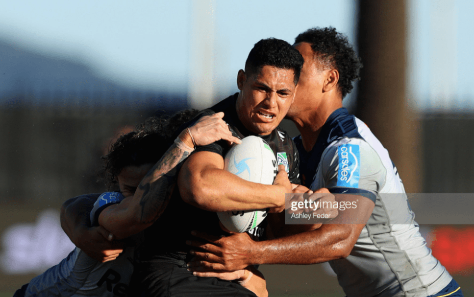 Aitken ended up with it, and held it up just long enough to draw in Reimis Smith and make room for Maumalo, who still had to withstand a big hit from Ieremia to smash down the Steeden for his last game as a Warrior. It was an emotional enough moment to eclipse Nikorima’s missed kick, steeling New Zealand into a strong charge up the middle on the restart, anchored by a great Bunty Afoa carry, before Ado-Carr once again took the high ball on the line, but with a stronger chase to contend with now, spearheaded by Murchie.