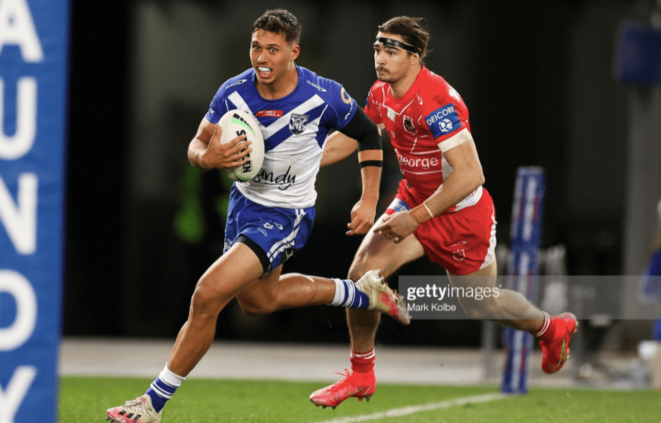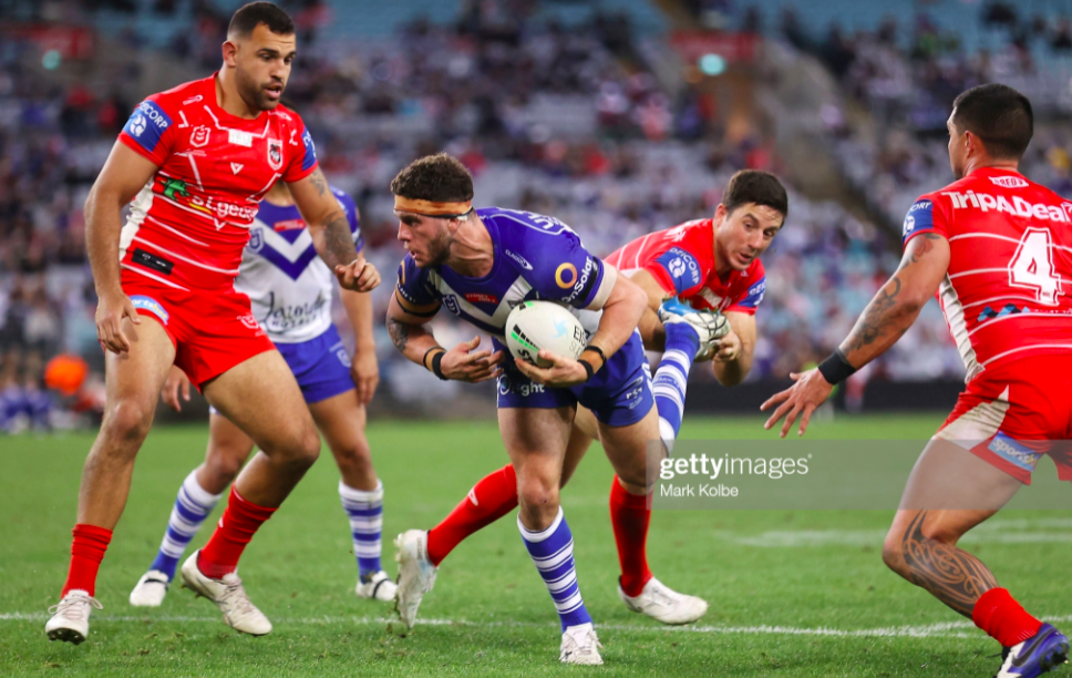 Like the Dragons before them, they reached the ten by tackle five, where we were treated to another volatile period of play. Once again, the Dogs came off the victors, as Jack Hetherington opted to run it on the last, taking Tariq Sims totally by surprise as he offloaded back to the halves, before the Dragons got a hand to the footy in the interim. Averillo built on that energy immediately, charging over the line on the very next play, where only a massive three-man tackle, spearheaded by Jack Bird, prevented him scoring then and there.