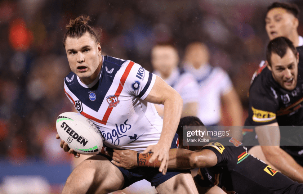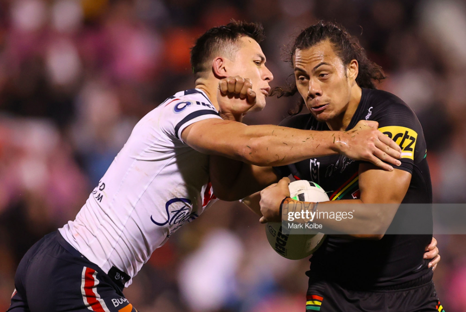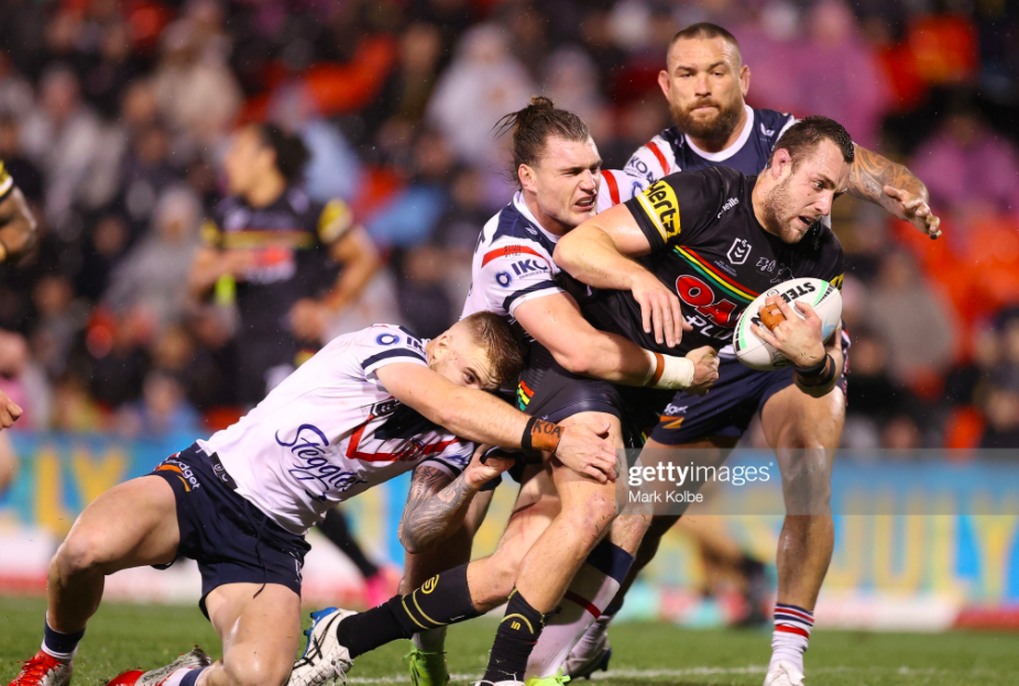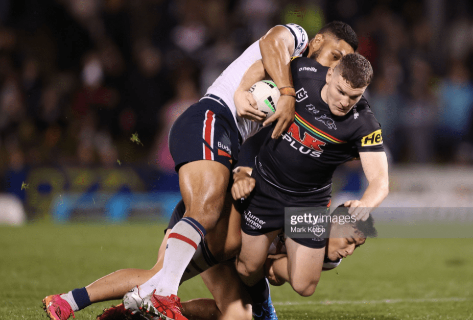 The Panthers were in a curious position when they hosted Sydney at the foot of the mountains on Friday night. After winning every game this season in Rounds 1-12, they’d lost two straight matches with Cleary off the park, and were no longer first on the ladder. For the first fifteen minutes, it looked like the Roosters might parlay this brief slump into a big win, rallying around James Tedesco to put down two unanswered tries that briefly stunned Penrith, as the rain poured down – the first wet weather footy for both teams since the torrential Round 2.