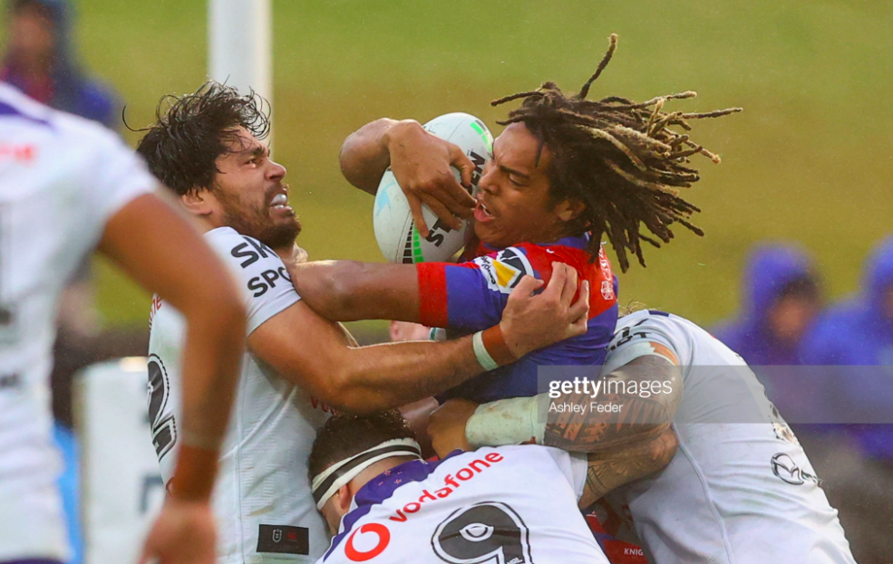 New Zealand had the scrum, but the Knights got the ball back immediately off a Walsh error, compounding this reversal with the first sustained field position of the game when Ben Murdoch-Masila was pinged for a dangerous tackle. Clifford grubbered as the rain got heavy over Hunter, conceding a penalty of his own for holding back a moment later, but making up for it with two big hits on Kodi Nikorima to contain the best run from the Warriors so far.