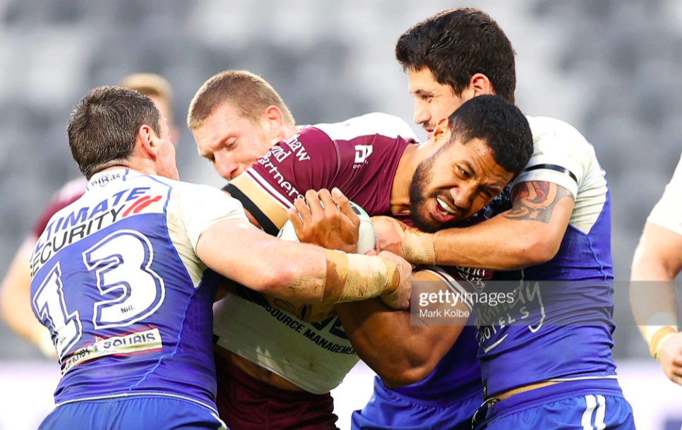 DCE got there before Flanagan, and once again Manly put a brief Bulldogs burst behind them, although the hosts had good speed on the next set – enough to tempt a crusher from Olakau’atu on JMK. Again, Canterbury had good field position, with a full set at the ten, and again the Manly line held up, while Jackson followed Katoa with an even more awkward backward ball – this time a cough-up that the Dogs only just contained, before Turbo collected the grubber on the last and dove back in field before the attackers could force a dropout.