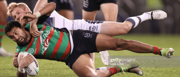 Yet Johnston showed that he can do more than speed up and pop it down on the wing, managing one of the gnarliest putdowns of the South Sydney season as he and the ex-Bronco rolled over each other on the chalk. Bouncing off his left arm and elbow, he kept the footy raised above his body under his right, only bringing it down when he was certain of having enough momentum to slide over the chalk, and ground it with both hands, without any risk of a double movement. Reyno added the extras, and the Bunnies hit thirty with thirty to go.