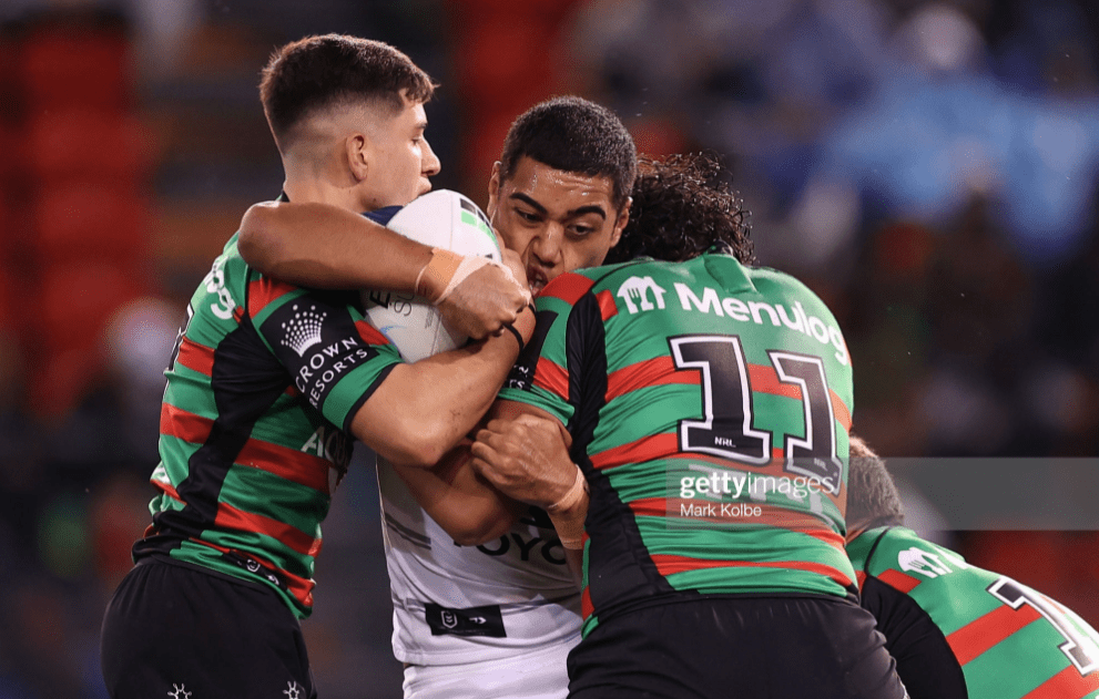 This was yet another milestone try, since Johnston now became only the second player in the NRL to score a double five games in a row, along with Semi Radradra in his watershed 2015 season. Su’A continued to cause chaos up the middle, building big post-contacts a set later, when he laid the platform for a near-break from Taaffe on the right edge. The Cows were really looking desperate now, and struggling to match South Sydney’s pace, epitomised by Lemuelu trying to intercept a Koloamatangi pass a few plays later, but losing it on the ground.