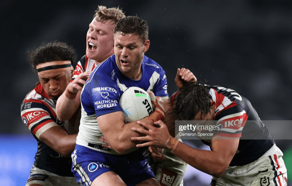 We’d seen a few good plays from the cult hooker, but he delivered on all fronts now, slamming in to skittle Hetherington in revenge for the offload, and single-handedly reclaiming the rhythm for the Roosters, who got six off a Corey Waddell offside at the start of the next set. Yet his men couldn’t match his energy, at least not at this point, as Verrills coughed up the footy a play later, and the Dogs packed the scrum at the thirty. Thompson targeted JWH again, Jackson brought it five metres out, and Katoa sent a poor pass bouncing to the left.