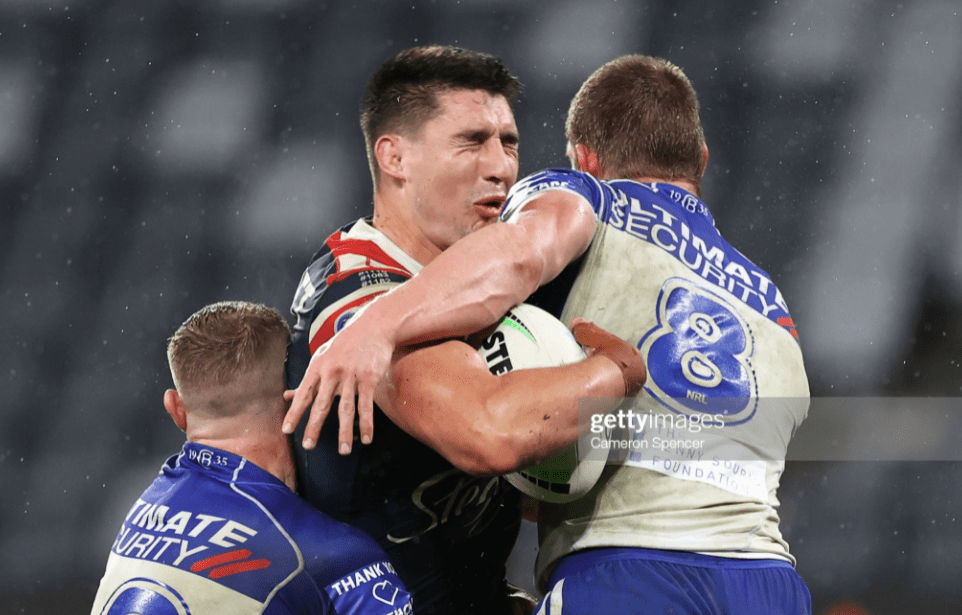 On the other side of the Steeden, the Roosters seemed exhausted by this aborted set, and started to succumb to the confidence issues that had plagued them since the Bulldogs made it clear they weren’t going to be a walkover. They’ve won every set this year when they hit 26 points, so they really needed to get one more converted try, although that stat just appeared to make their game more precarious, as Butcher conceded a ruck error to give the Doggies a bump up field, while the rain grew torrential over Parramatta.