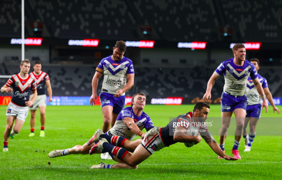 While Walker didn’t get the conversion, he deserved credit for the subliminal silkiness of this assist – possibly his best pass of the game, as he drew in Atoni and cleared up space for Ikuvalu in the same instant. In one sequence, Ikuvalu had taken the Roosters from end to end, cementing their dominance at both try lines, so this was a pretty emphatic closing statement for the visitors, even if they didn’t score another four-pointer over the next 26 minutes.