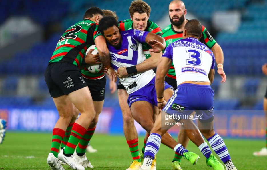 Averillo hasn’t been especially successful from the sideline in the past, so seeing him boot it through from both sides really bolstered the Doggies’ belief here, cementing their sense that, like their kicker, they might just achieve the improbable if they doubled down. For the next few minutes, the were unable to deliver, and yet no sooner had Meaney and Hoppa made successive errors than they combined to prevent another South Sydney try at the very death – offloads from Gagai and Johnson, followed by a mad dash down the left sideline by Walker.