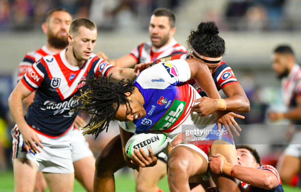 It falconed off Watson, and arrived at Sausao Sue, who kicked it backwards with a martial arts inspired move that momentarily built some Newcastle momentum up the right edge, only for Teddy to dig in the studs, spin around Ponga, and burst back in field to elude a dropout. King tried to rally the troops with a barnstorming charge into Butcher next time the hosts had ball in hand, but if anything it galvanised the Roosters into a rapid left edge sweep that ended with Crichton offloading to Tupou right on the line, before they sent it out to the other wing.