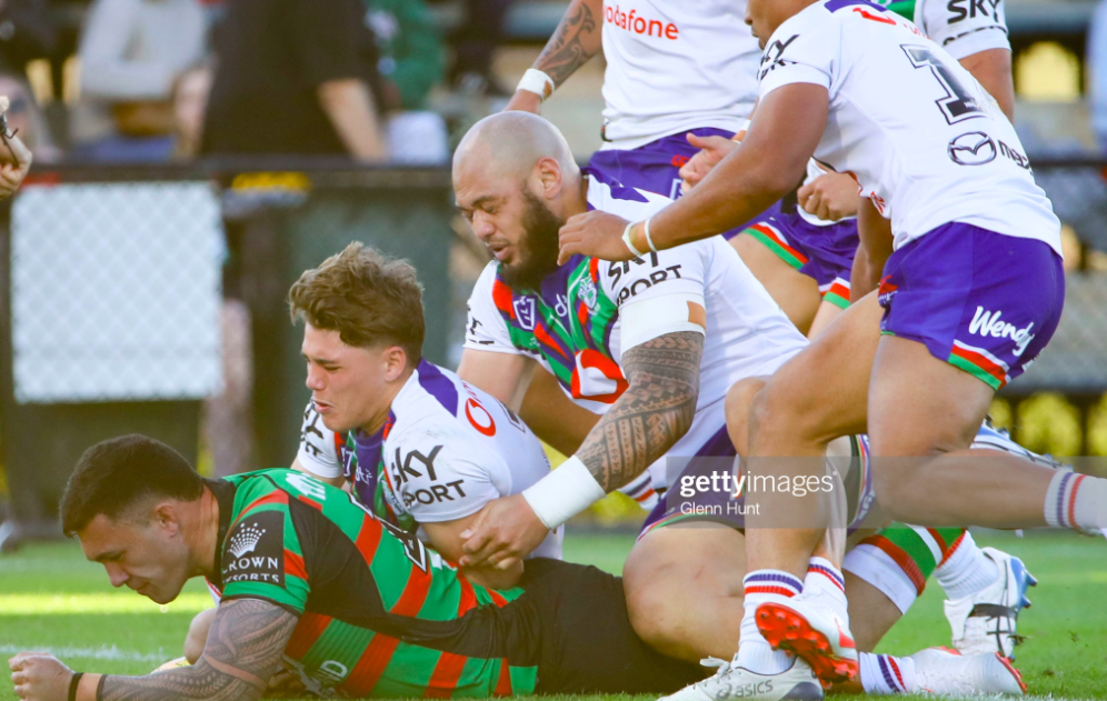 The Bunnies might have scored six unanswered tries, but the Warriors had rallied heroically here, dominating the last bout of field position and bookending the first forty. At the end of the day, they were only eighteen points behind, so the first few sets back would prove critical. In particular, it was critical that New Zealand withstand South Sydney’s first set, and they looked good for the opening tackles, coming in hard and fast with the defence. That all changed, though, when Pompey slammed into Latrell and knocked it on to concede six again.