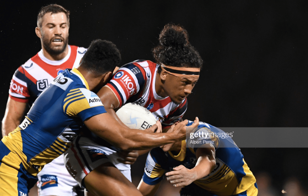 Dylan Brown was in place to scoop it up and work it back to the ten metre line, and yet this was only a momentary let-off for Parramatta, since the Roosters rallied again at the start of the Eels’ next set, when Tupouniua reached an arm out to intercept a Gutho-Sivo pass. He didn’t make contact with the football, but he did unnerve Sivo sufficiently to force the knock-on, inducing another Gutho blowup even though this was a pretty poor pass in the first place.