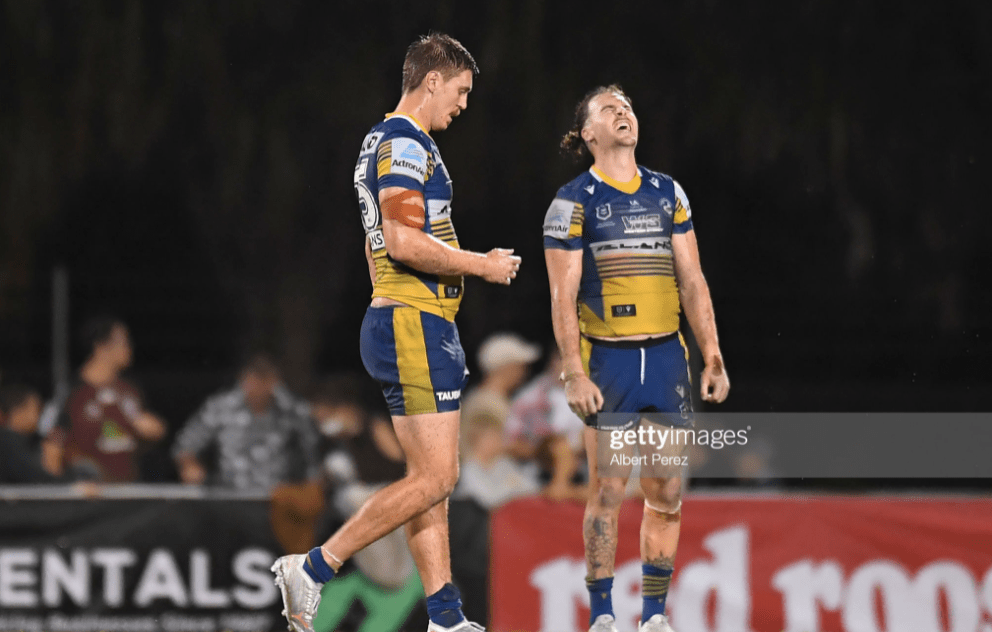 Even here, though, they couldn’t execute a decent close-range set, as Dylan Brown came up with an abysmal option on the third, a limp grubber that didn’t have chance of ever reaching the try line. The Eels’ night got worse as word came down from the sheds that RCG had followed Shaun Johnson with a game-ending hamstring injury, and yet the Sydney City backline made yet another mistake under the next high ball. This time it was a collaborative error, as Tupou allowed Opacic and then Gutho to knock it back, before Teddy knocked it on.
