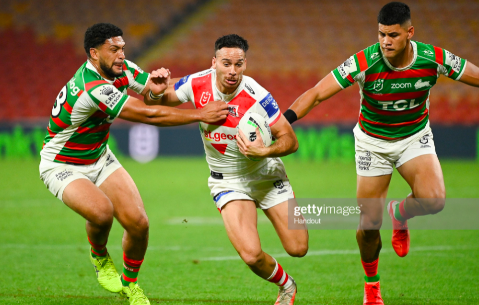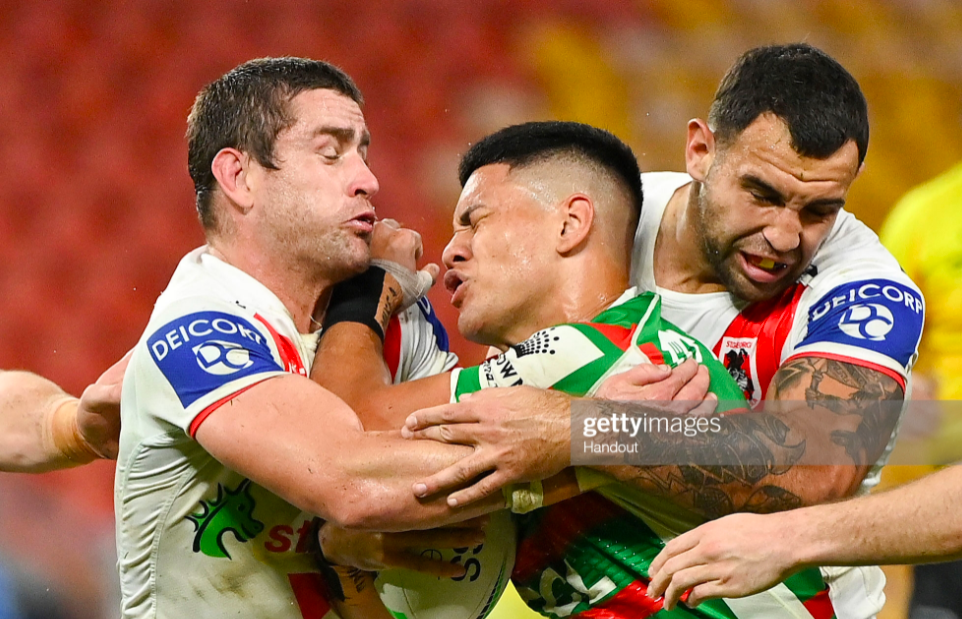 The Dragons needed a fast start to contend with a top four team – they’d given up 32 points in their last two games against the Bunnies, who’d scored a minimum of 32 in their last five fixtures. Yet Souths had the scrum now, and moved fluidly through their set, with Tom Burgess eating some post-contact metres early in the count, and Adam Reynolds hoisting it high on the last. Tyrell Sloan mirrored Feagai with a fumble beneath the kick, and Norman again compounded the error by conceding the opening penalty – an escort on Latrell Mitchell.