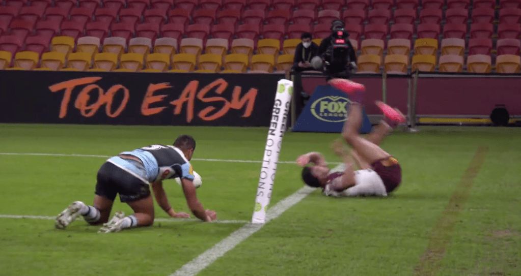 Perhaps that’s why Cronulla seemed to pre-emptively concede the try as soon as Turbo received the footy, since he looked as if he were playing in slow-motion in real time, making for an especially languorous and leisurely replay once he put it down. He barely had to dummy, and almost came to a complete halt as he pivoted away from Tracey and Mulitalo on the right edge, before jogging past Brailey, and skipping over an ankle tap from Fifita and then an ankle brush from Kennedy, to stroll over untouched, setting up an easy Garrick conversion.