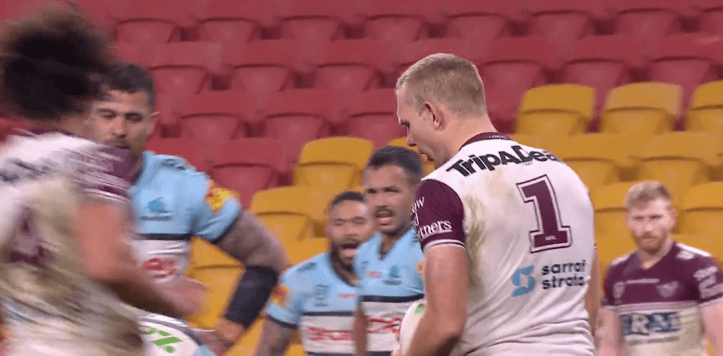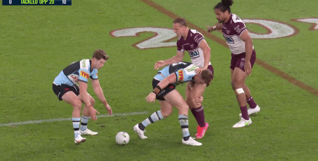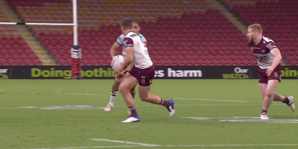 Turbo caught the kickoff right on the line, and Toafofoa Sipley took the first hit, before Turbo had his first carry on play four, and Daly Cherry-Evans ended with a deep bomb to Ronaldo Mulitalo’s corner. The Sharkies didn’t make quite as much field position, forcing Braydon Trindall to kick on his own forty, while the Sea Eagles got the first burst of field position on their next set, following a ruck error from Blayke Brailey and then marginal high contact from Briton Nikora on Marty Taupau, before Turbo delivered his first visionary play of the evening.