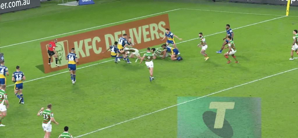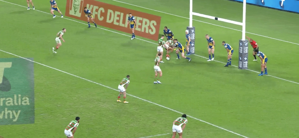 We were only five minutes into the match, and it had already become an arm wrestle, giving no real hint of the South Sydney drubbing to come. Dylan Brown hoisted it high at the end of the following Parramatta set, and the footy falconed off Tom Opacic and over the dead ball line, giving the Bunnies a twenty-metre restart and seven tackles to play with. Nicholls was raring to break through the line on the next set, yet was foiled by a Reed Mahoney ankle tap, and then nearly sliced through a second time before Walker opted to run it into the left wing.
