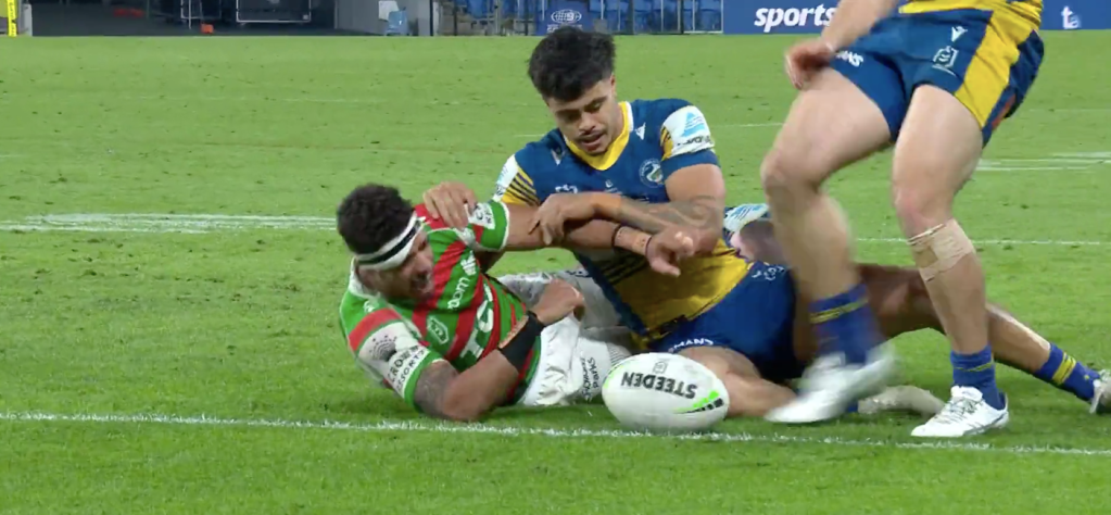 Reynolds sent it end-over-end at the end of the next set, in what was starting to feel like a bomb-off between the two kickers. Paulo tried to steady the ship with a bullocking carry two plays into the next set, making more metres post-contact than any forward so far, and laying the platform for a strong Gutho run that tempted a desperate high tackle from Milne, who was put on report for his effort. This was a big boost for Parra, who had their first full set inside the South Sydney twenty, and their most pummelling series of tackles from close range.