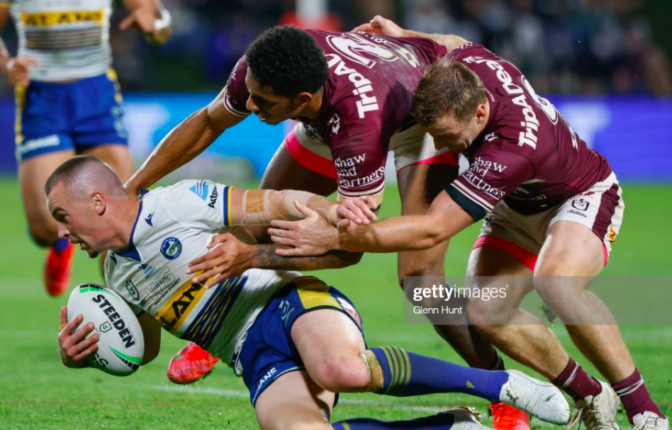 From this point, then, the Eels’ priorities subliminally shifted – instead of trying to match Manly, they had to keep them out, avoid conceding a too traumatic torrent of points. They got a big scare on the restart, when the Sea Eagles almost made it a trio to rival their two trilogies against the Sharkies. DCE was the man with the plan, eschewing the kick to pass to Turbo, who took a totally unprepared defence by surprise, breaking through the line, and popping it back to Walker, who didn’t manage to pass on to DCE before Moses contained him.