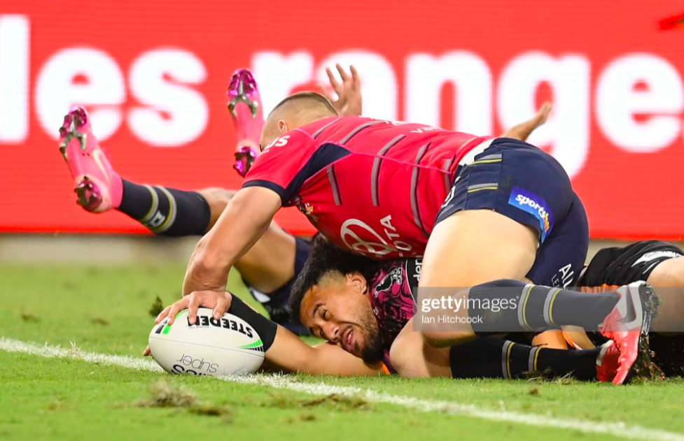 Yet the Cowboys rose to the challenge, producing one of the most convulsive conclusions of the year, starting with six again, as Talau went down in backplay, after copping a finger in the eye during a big collision on Granville. Dearden drifted across field, assessing his options a couple of times before bypassing Nanai to lob a high wide ball out to Asi. Yet Nanai and Asi made good on their botched combo now, as Asi wrong-footed Chee Kam and Brooksy, and fed it out for Nanai to find space up the right wing and return it back in to him from five out.
