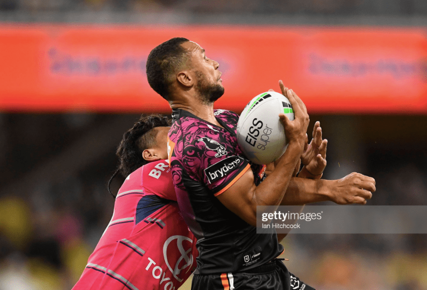 He also drifted back in field, bringing the set full circle as Utoikamanu made it a trilogy of terrific runs up the middle – this time by collecting a short ball from Brooks, and dragging Luki nine metres, clinging on to his collar, to slam over the line for the opening try. This had been a great opening statement from the Tigers – up the middle, pivot to the wing, and back to the middle – consolidating their confidence as Adam Doueihi booted through his first conversion.