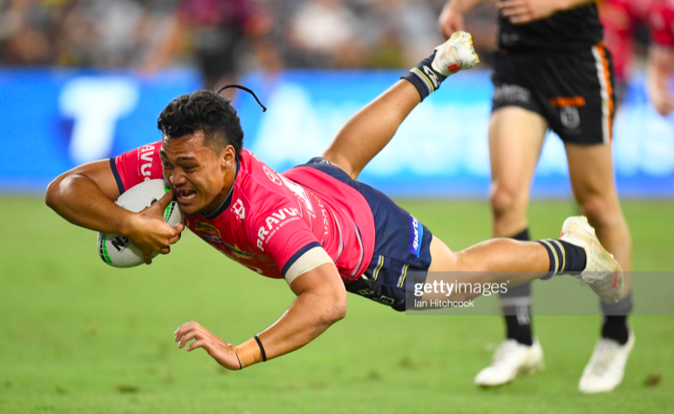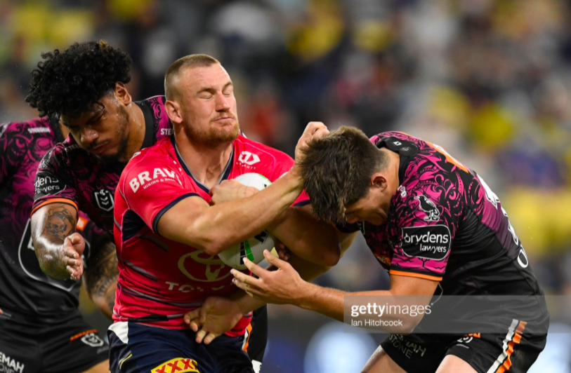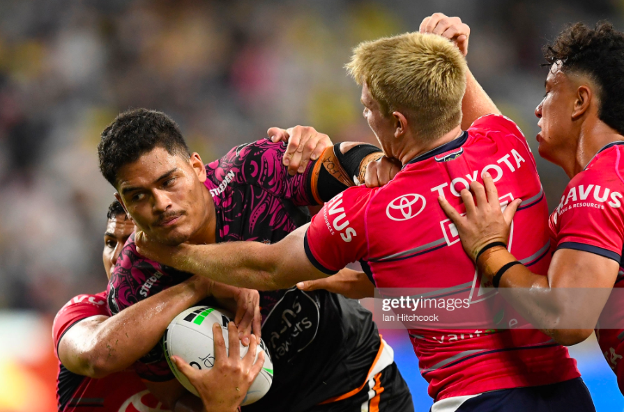 The Tigers had to regather on the next set, and they did so in two ways. First, they showed the Cowboys (who hadn’t had any second phase play yet) that they could correct their offload game, as Chee Kam popped it out to Utoikamanu just before a pack of Cowboys dragged him over the try line, while Nofa made up for another slip by offloading through a Mitch Dunn tackle thirty metres upfield. Second, Doueihi got his men some breathing-space with a hard kick over the side as Jeremiah Nanai became the youngest Cow to debut since Kalyn Ponga.